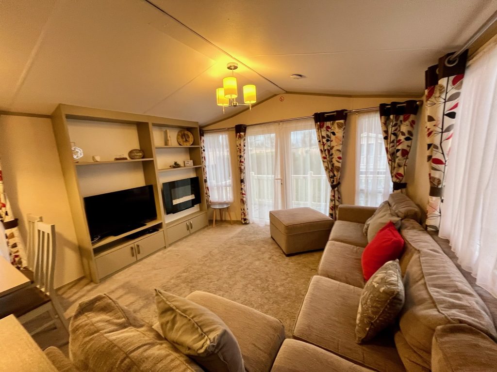 The ABI Oakley Exclusive is for sale at the Butlin’s Minehead Resort, Somerset. It is located on Lakeside Quey 171 and has a small patio with garden table and benches. The interior is decorated with calming creams and contrasting upholstery. The lounge is light and airy with the large patio doors leading out onto the sundeck. The large L shaped sofa faces the fireplace. The log effect fire creates extra warmth during the winter months. The television sits nicely over the fire which is surrounded by storage cupboards and modern shelving.