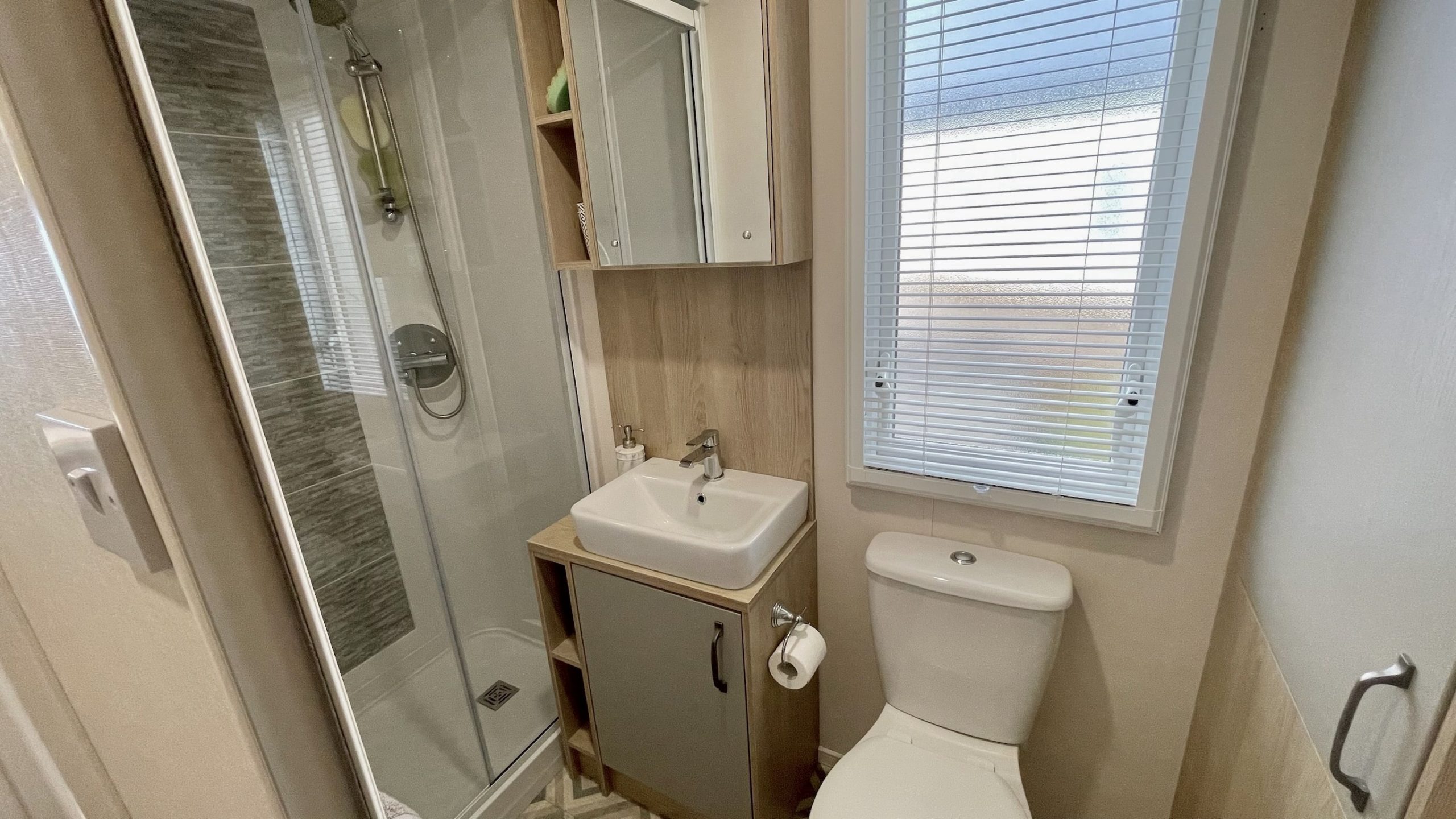 The family shower room features a modern shower cubicle, WC, and a washbasin with a built-in cabinet for storing your bathroom essentials.