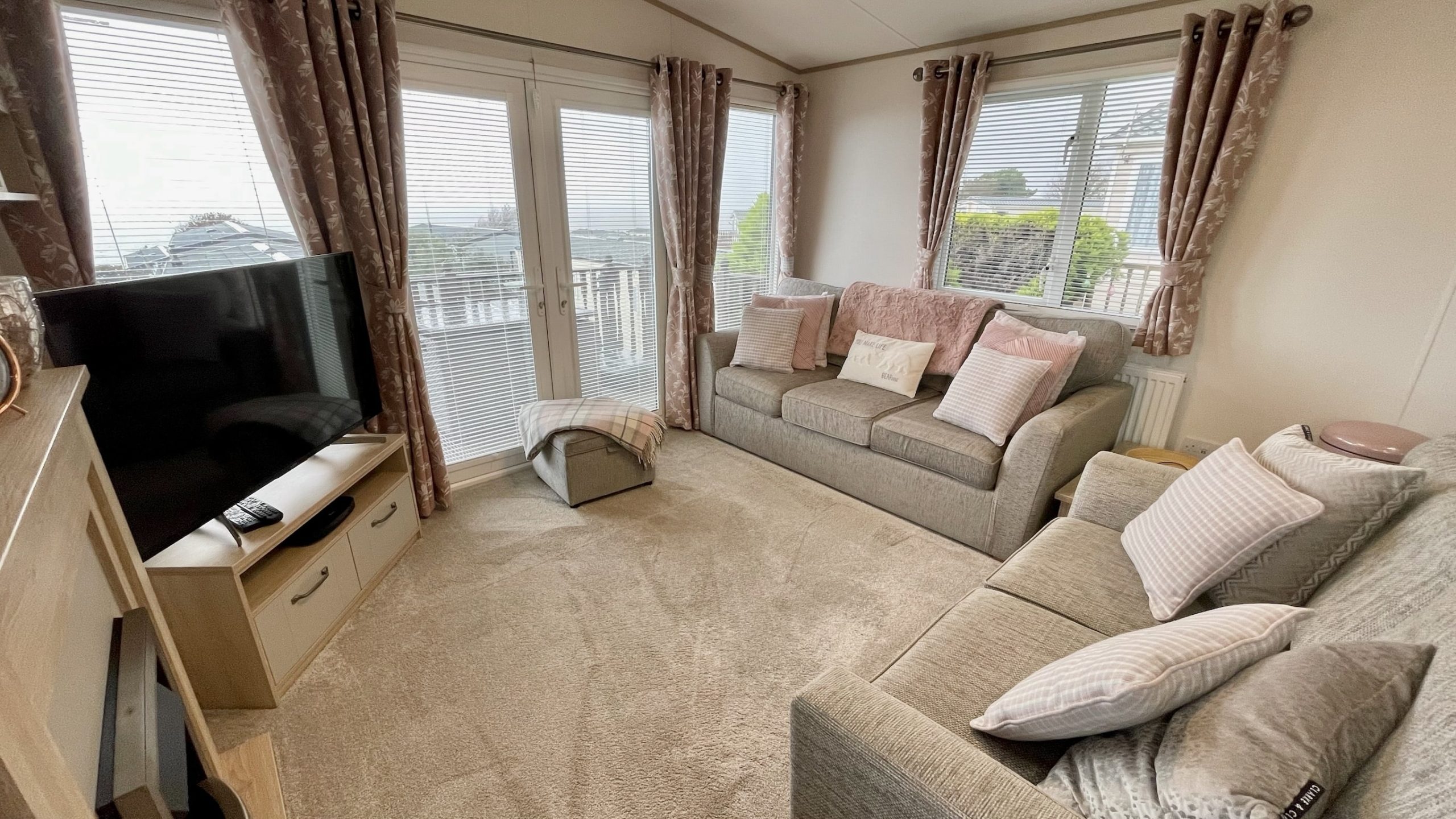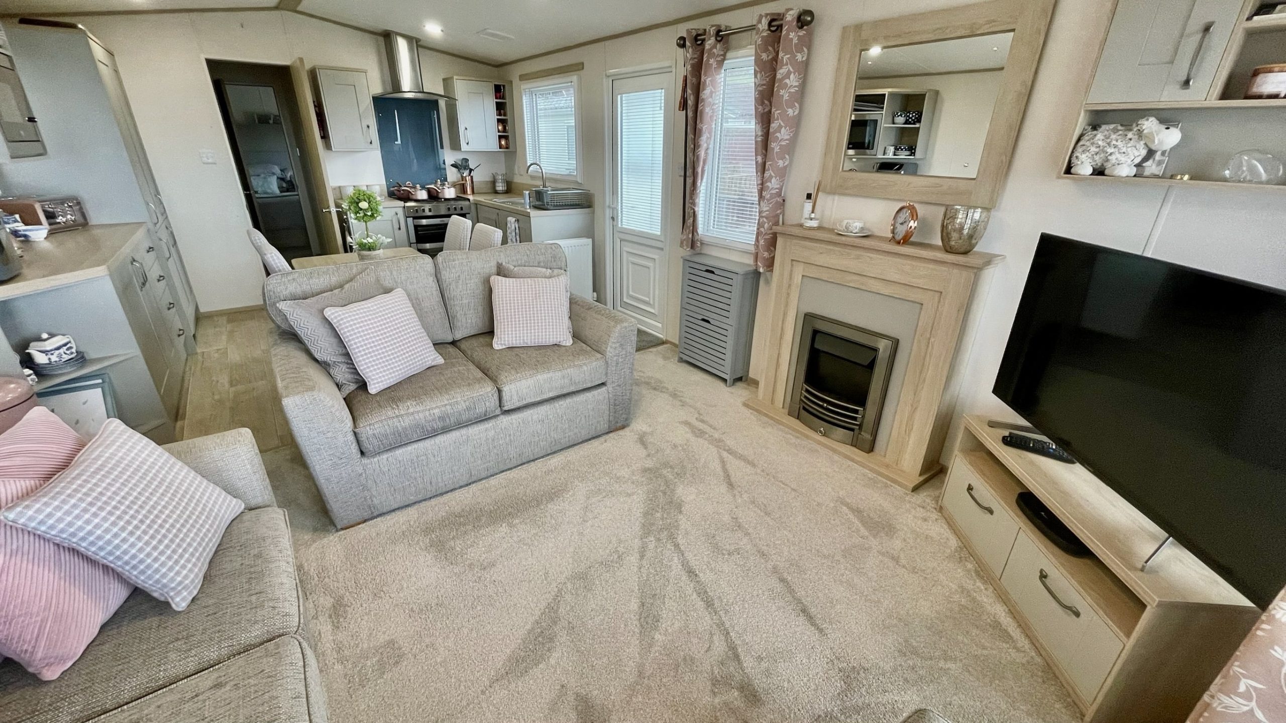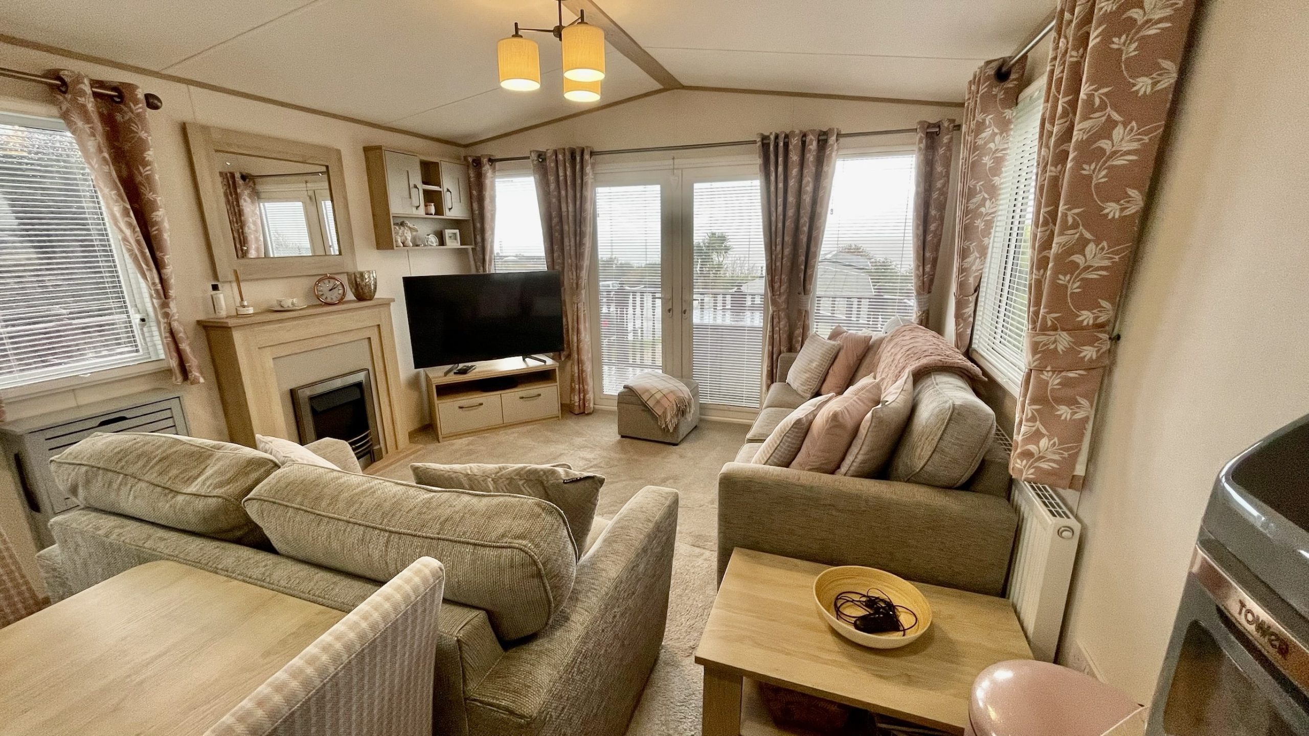 The well-furnished living area creates a cosy atmosphere that makes you feel at home. It includes a two-piece sofa suite, a footstool, a coffee table, a TV cabinet and a stunning fireplace. The double patio doors invite a gentle breeze to flow in during the warmer months, creating a fantastic space for outdoor dining.