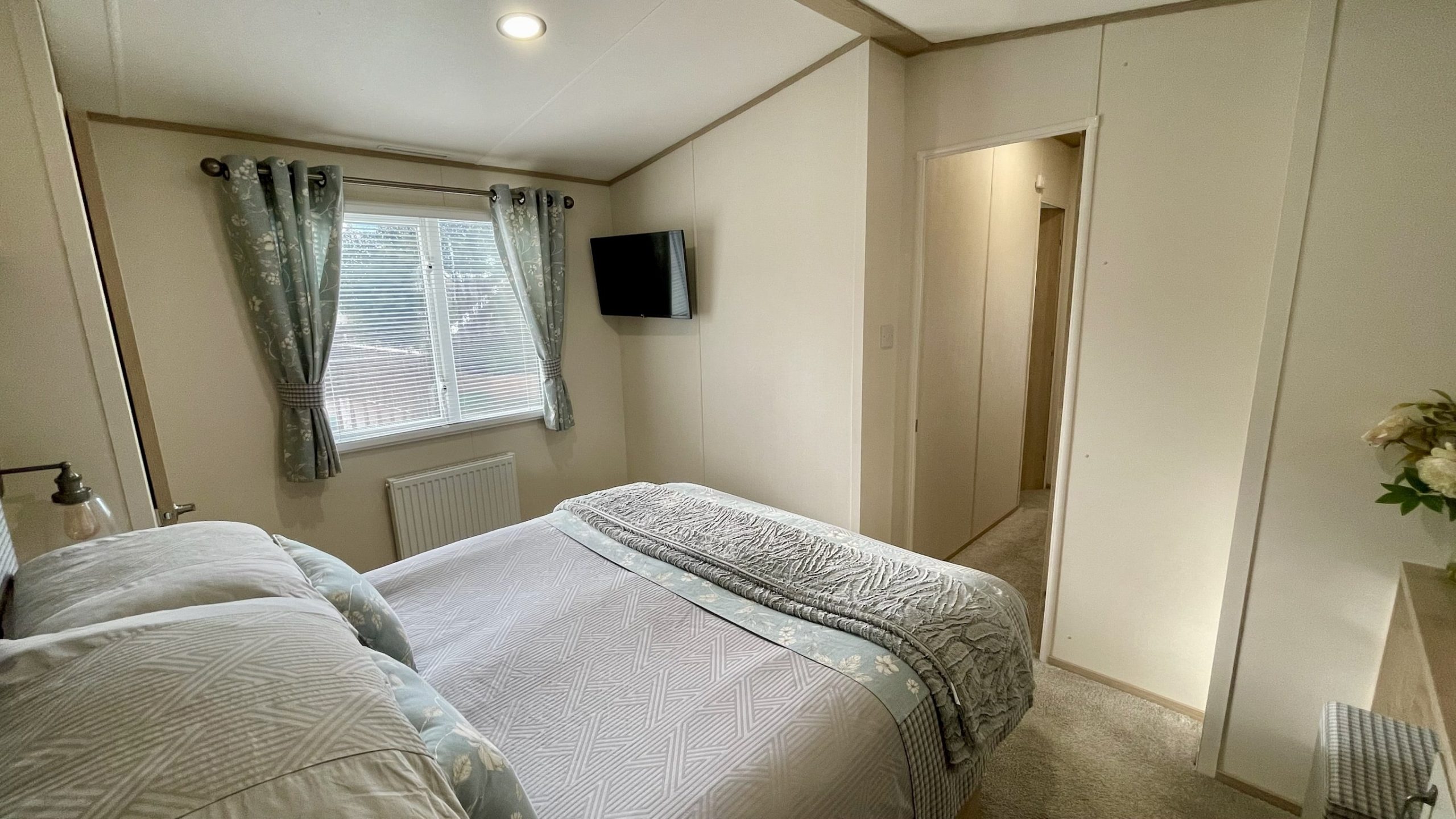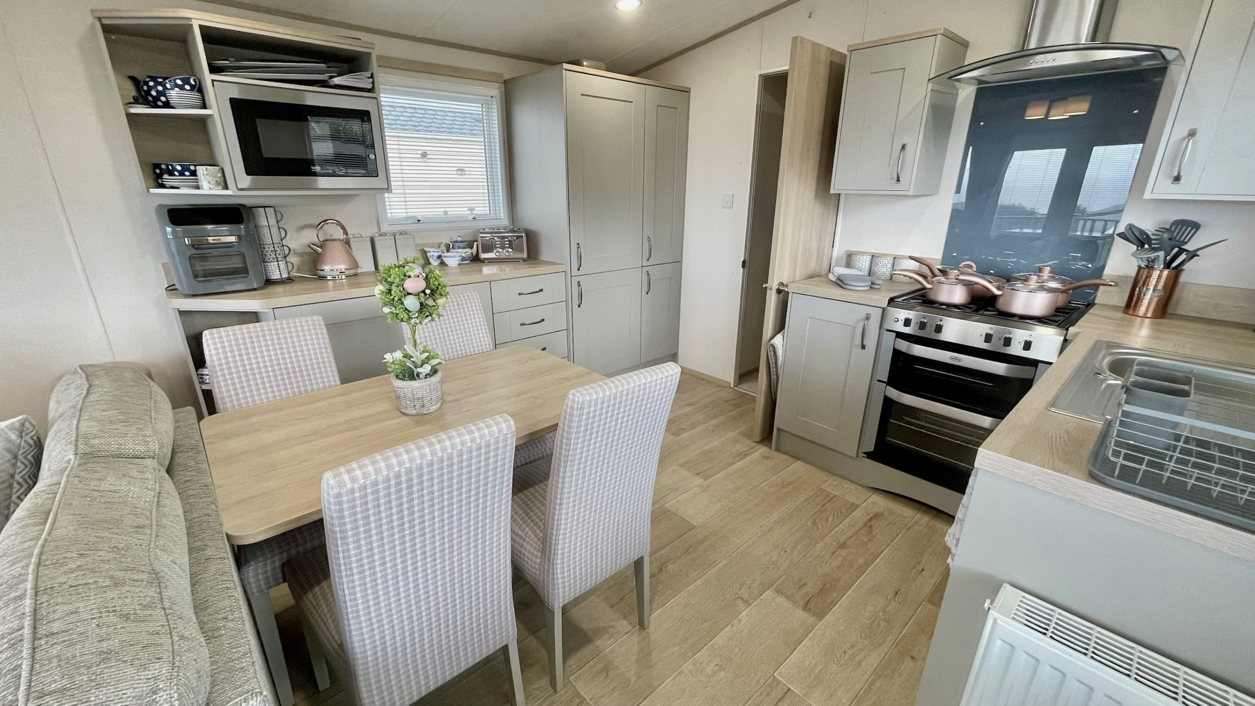 The well-equipped kitchen and dining area have everything you need to kickstart your holiday. It includes an integrated fridge-freezer, microwave, washing machine, dishwasher, and a gas oven with a hob. The large cupboards and drawers provide ample storage space for all your kitchenware. The dining table, accompanied by four comfortable chairs, is perfect for enjoying family meals together.