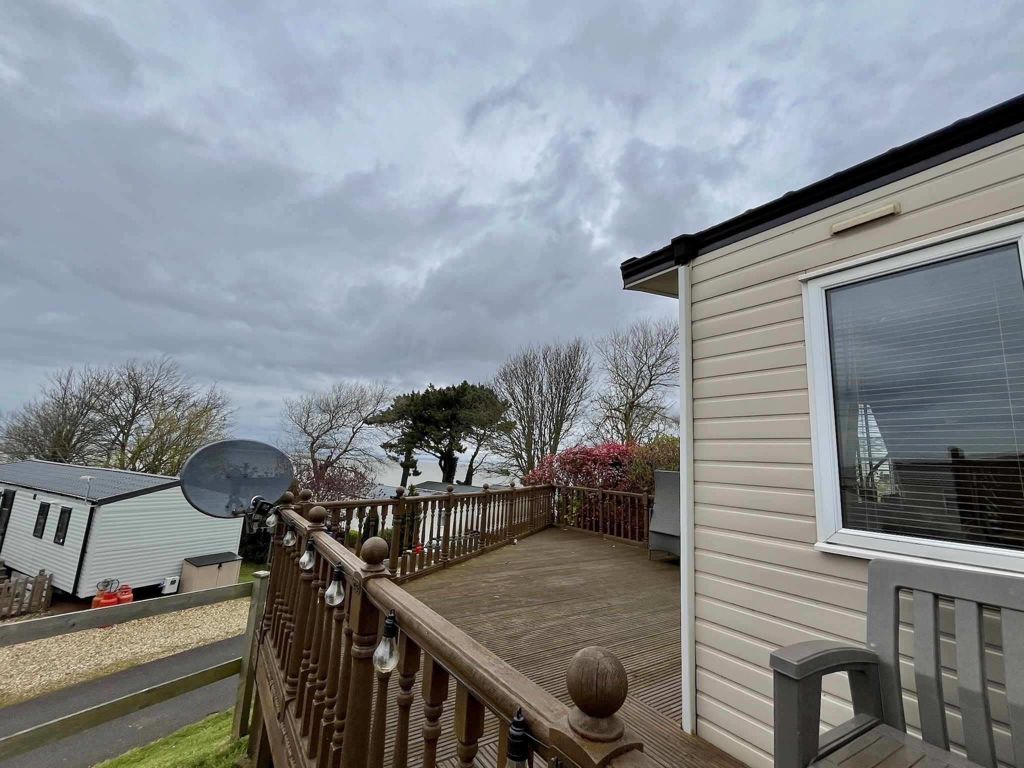 The Cosalt Studio Extra has been well looked after and is in good condition. The open-plan living area is spacious and light with the patio doors opening out onto the large decked area. There is plenty of space for garden furniture or sunbeds to make the most of the view. The lounge has a sofa with 2 armchairs, a nest of tables and a floor-standing light. There is a TV cabinet with plenty of cupboards and an electric fire to keep you warm during those winter months.
