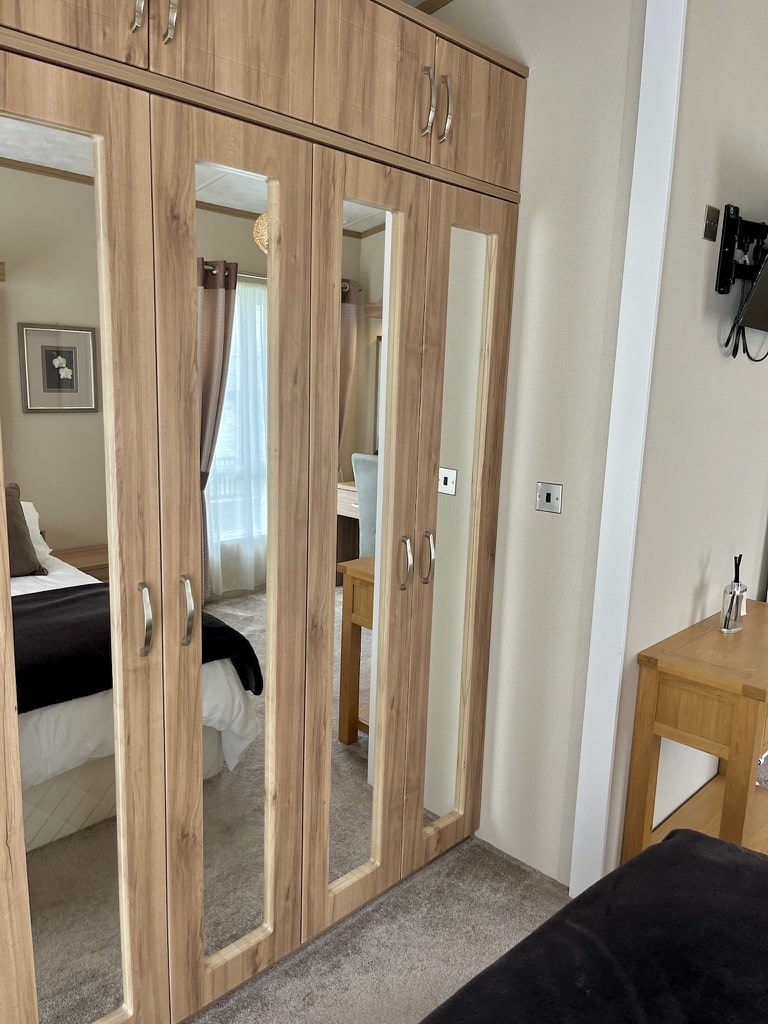 Moving down the spot-lit hallway, the first double bedroom awaits on the left. The stylish headboard spans the back wall, allowing for an easy conversion into a twin bedroom. This room also features bedside tables, large mirrored wardrobes, and a small dressing table.