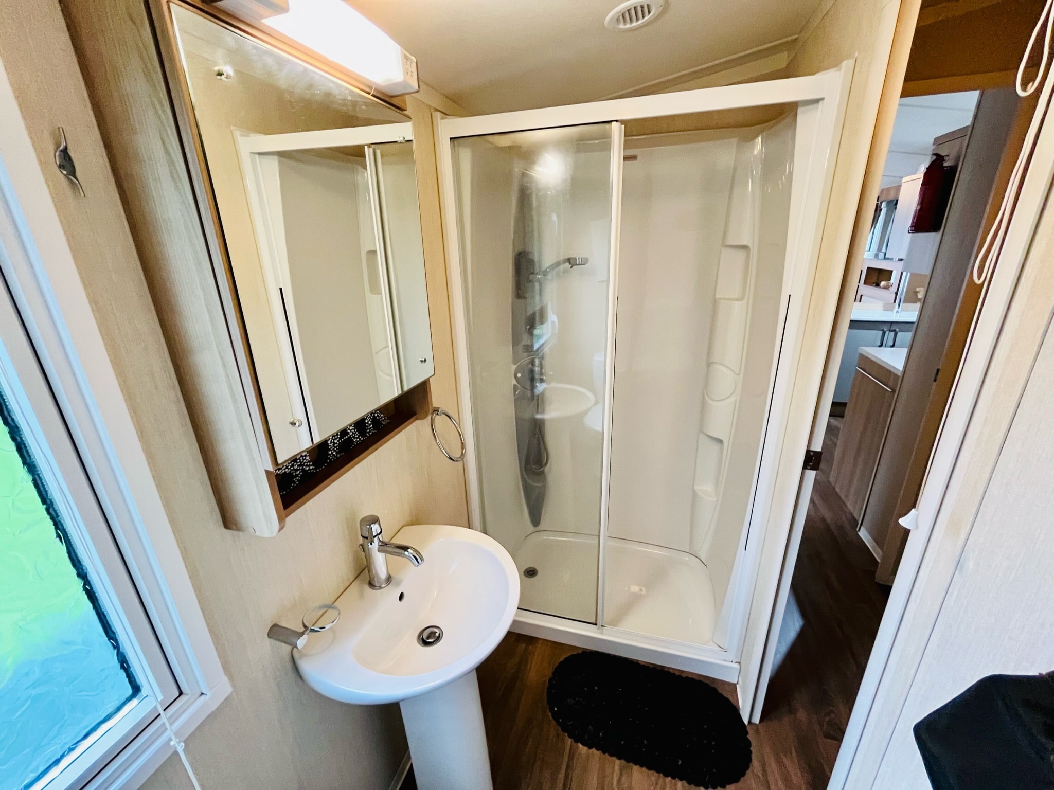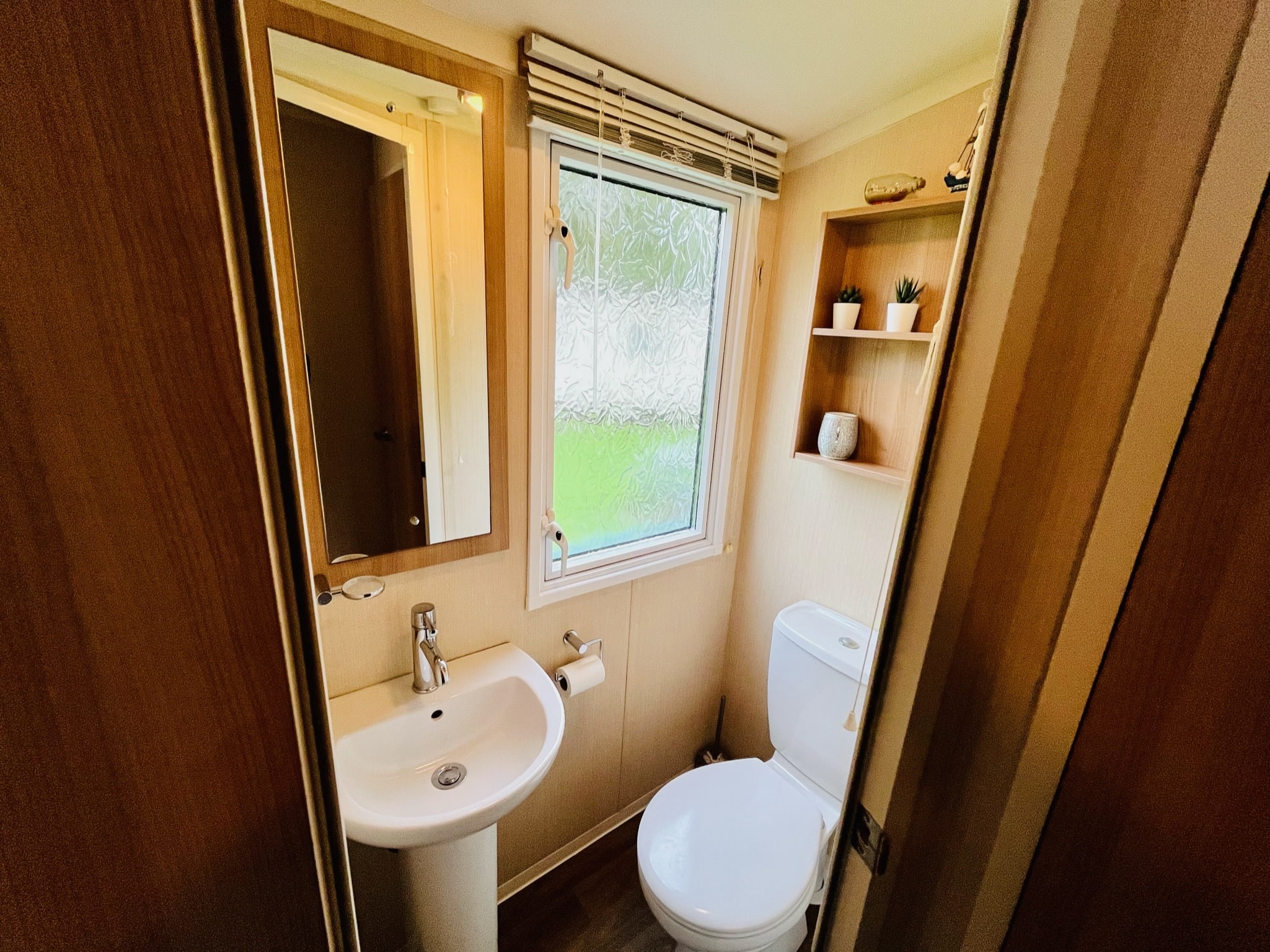 The caravan offers three bedrooms. The two twin rooms feature bedside cabinets, over-bed storage, and small wardrobes, while the spacious master bedroom boasts a dressing table with a stool and the added luxury of an en-suite WC with a handbasin.