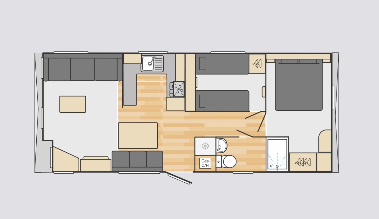 The open-plan living area invites relaxation with its large, comfortable L-shaped sofa that easily converts into a bed. In addition to the sofa, the living area includes a coffee table, a TV cabinet, shelving and a flame-effect electric fire for the colder months at Beverley Park. The double front-opening patio doors are a fantastic addition, for letting the summer breeze in or an excellent area for enjoying a delicious meal on the front deck.